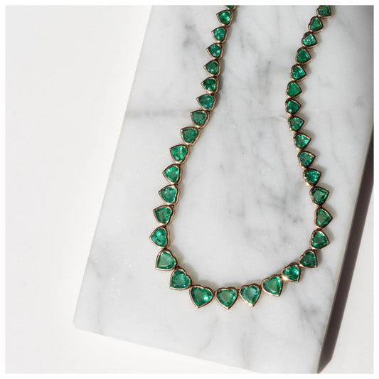 Heart Emerald 925 Sterling Silver Over in 14K Yellow Gold Plated Bezel Set Emerald Heart Tennis Necklace, Heart Emerald Necklace