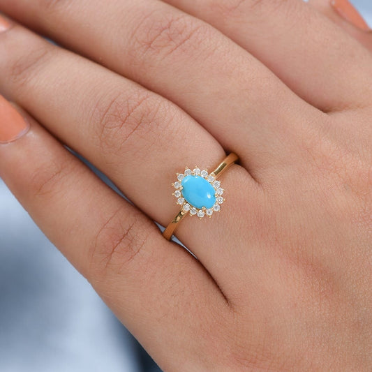 Natural Sleeping Beauty turquoise ring , Oval shape turquoise halo engagement ring, Bridal ring, Anniversary Gift, December Birthstone Ring