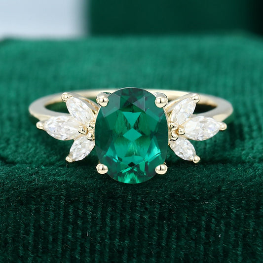 Oval cut Emerald engagement ring, vintage unique marquise cut diamond cluster ring, yellow gold moissanite ring, women bridal promise gift
