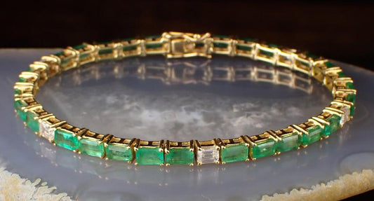 Emerald Bauggate Tennis Bracelets, Solid Gold Teenis Bracelets, Diamond & Yellow Gold Tennis Emerald Bracelet