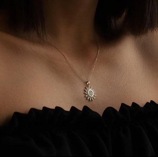 Sun Pendant 14k Yellow gold, Diamond Sun Pendant with Adjustable Chain, Gold Sun Charm Pendant, 14k gold necklace, Valentine Day Gift