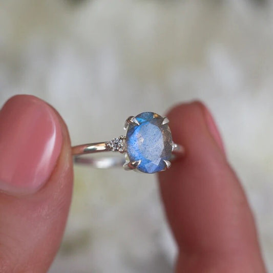 925 Sterling Silver Oval Blue Sapphire and Diamond Ring - Elegant Jewelry